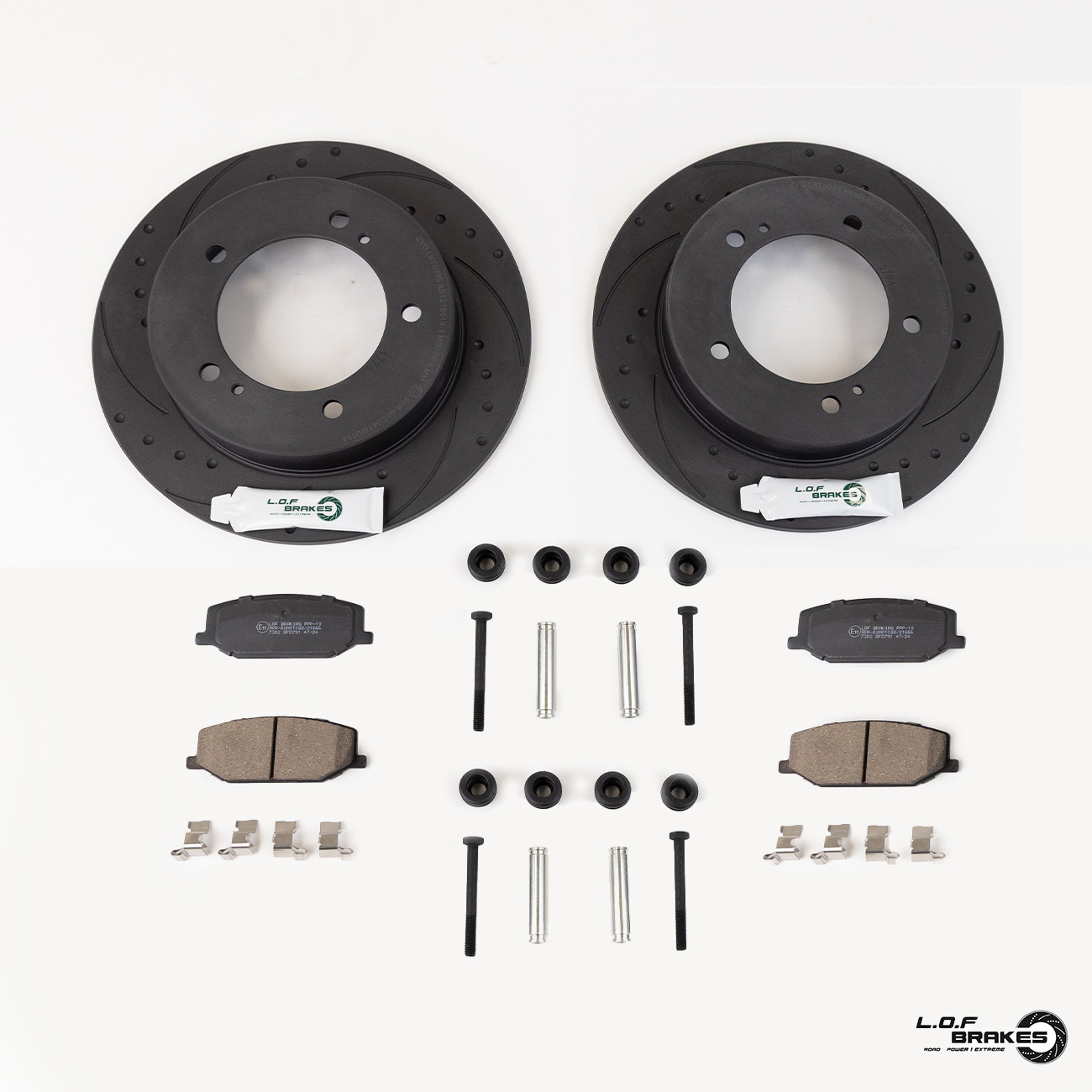 The LOF POWERspec Brake kit is designed for Heavy loaded Jimnys, Our Discs and Pads are of an ‘OEM’ spec, made to the same Quality and Tolerances as Original Genuine brake components. Our POWERspec kits come complete with fitting kit, including fasteners, Pins, anti rattle shims and the correct grease where necessary! Discs: Dimpled and grooved, with black phosphate finish for corrosion resistance and removal of Debris & Heat. Pads: Performance Organic/ Ceramic friction material.